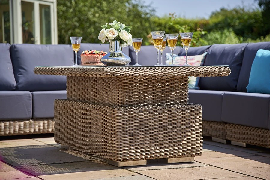 Part of our luxurious Kensington Collection, this outdoor table combines timeless design with modern convenience. Weatherproof rattan in Mushroom Brown has been expertly handwoven around a sturdy aluminium frame to ensure premium style and strength. Weather-resistant and easy to clean, this table can remain outside all year round with little maintenance required. In its lower position, the table is ideal for use as a coffee table, while its raised position suitable makes a perfect dining table for Lounging Furniture.