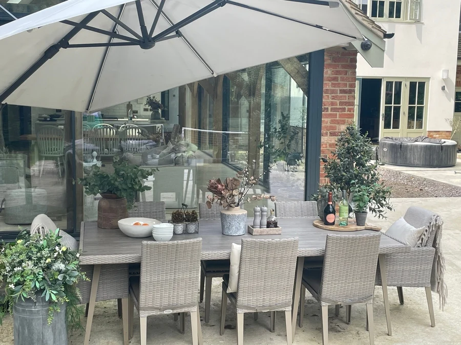 This stylish rattan garden table comfortably seats up to 6 people, an ideal size for entertaining family and friends for casual drinks or an alfresco dinner. Expertly balancing modern design with practicality, the table has been handcrafted using powder-coated adjustable legs aluminium and partly finished with all-weather rattan for a timeless touch. The tabletop is made using easy-to-clean HPL with an integrated Parasol hole for convenient shade should you need it.