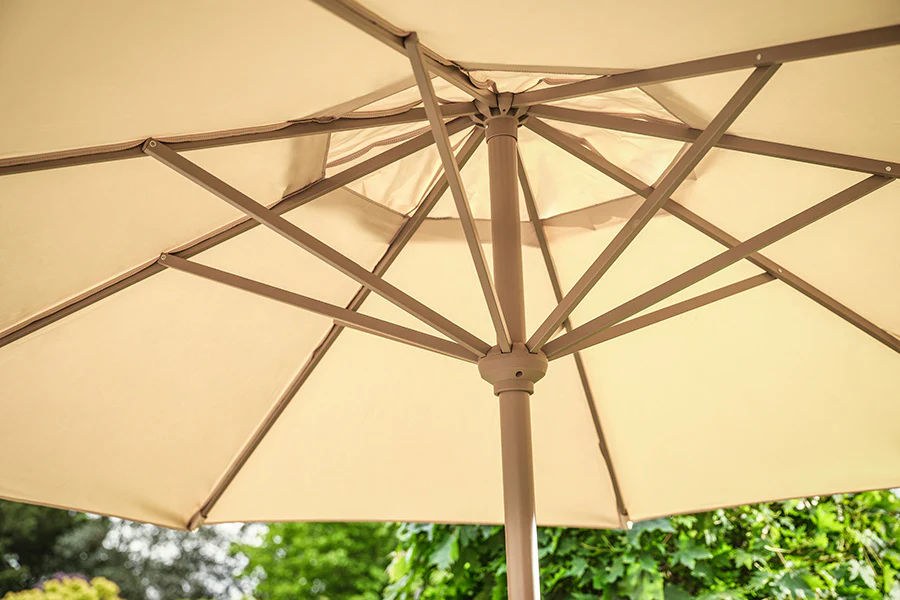 Create some much-needed shade for those hot summer days with this 3m Deluxe Round Aluminium Parasol in an elegant almond-coloured fabric. This medium-duty parasol is particularly suitable for round tables which are 120-170cm in diameter. The parasol features a sleek canopy, a frame finished in a durable champagne paint, and a crank handle so you can easily adjust the height to suit your needs. It comes with a cover to keep the parasol clean when it’s not in use, meaning you’ll have a fantastic, durable piece of garden equipment for years to come. The frame and 4.8cm pole, made from 100% aluminium, require minimal maintenance. Ensure the parasol is safe and secure by using our 25kg Concrete Base, which you can purchase separately.