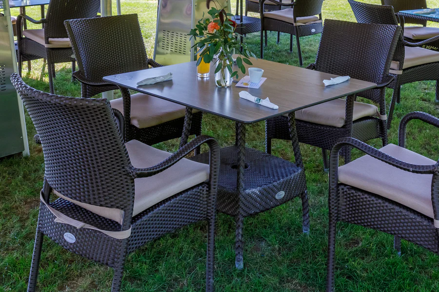 Ideal for small patio areas, this elegant dining set seats 4 guests in comfort and style. The table and chairs have been expertly handwoven using our finest Bronze weatherproof rattan to withstand the elements all year round, while the round table's wood-effect HPL tabletop is antibacterial and easy-to-clean. Elegant and convenient, each stacking armchair can be easily stacked away when you need to tidy up.