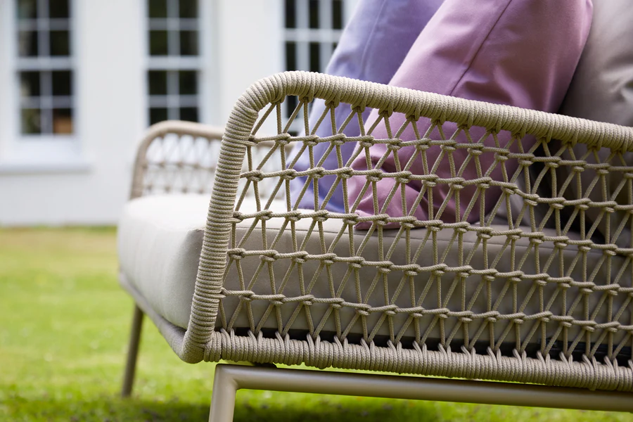 Inviting contemporary elegance into any outdoor space, this modern garden sofa has been expertly handwoven using premium rope to ensure unmatched quality and beautiful style. The sofa comes complete with our exclusive 100% Waterproof Cushions in Taupe to provide you with sublime comfort every time you relax alfresco. Glides on the sofa's feet ensure no scratching on your patio so that you can enjoy your garden, worry-free.