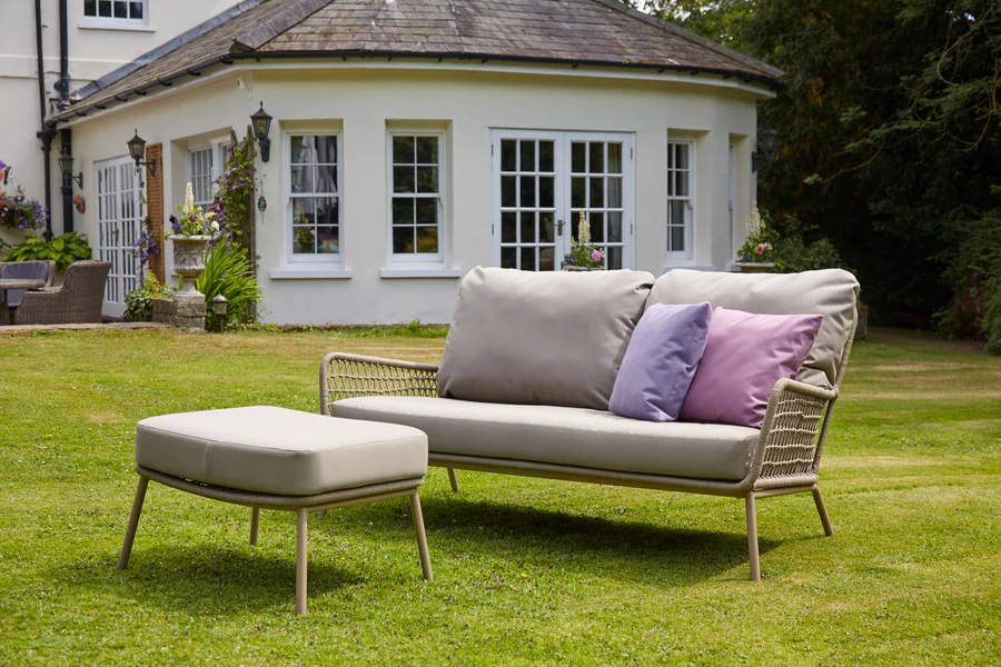 Part of our beautiful Cannes Collection, this footstool has been beautifully handmade by tightly intertwining, knotting and weaving premium Taupe rope around a matching chic stainless steel frame. One of our exclusive Fully Waterproof Cushions in matching Taupe to complete this perfect accent piece.