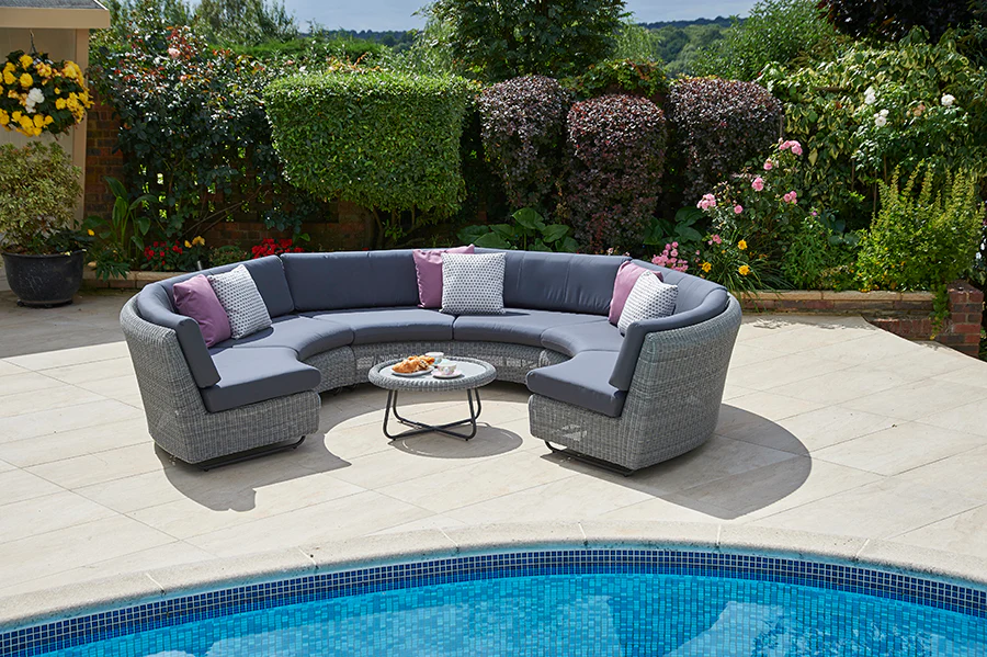A beautiful, intimate circular seating arrangement, this Cliveden lounging set has been designed for afternoons relaxing in comfort with the people you love. Chic weatherproof Pewter rattan has been expertly handwoven around powder-coated aluminium frames and finished with nylon feet to prevent scratching on patio stones and decking. For sumptuous comfort as well as worry-free relaxation, our exclusive 100% Waterproof Cushions in Grey ensure absolute protection from the elements and spillages all year round. The matching round coffee table with a weatherproof HPL top is the perfect finishing touch to complete this premium modular set.