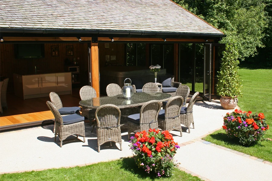 Ideal for large gardens, choose this stylish Mayfair Dining Set to become the centrepiece of your outdoor space.