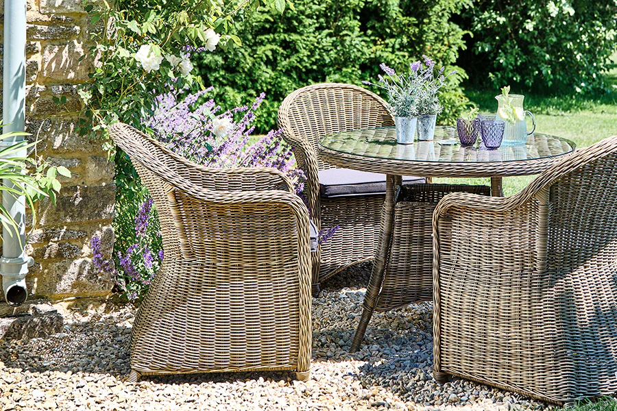 Ideal for smaller patios, gardens and decks, this gorgeous dining set is supremely comfortable and timelessly stylish. Each piece has been crafted using a mild Olive Brown synthetic rattan woven around durable aluminium frames to guarantee over 2,000 hours of sun resistance. The elegant dining armchairs have a finessed finish and cosy Grey or Beige seat cushions for added comfort, while an easy-to-clean safety glass tabletop and parasol hole at the centre of the round dining table offer yet more practical benefits to help you whenever you entertain.