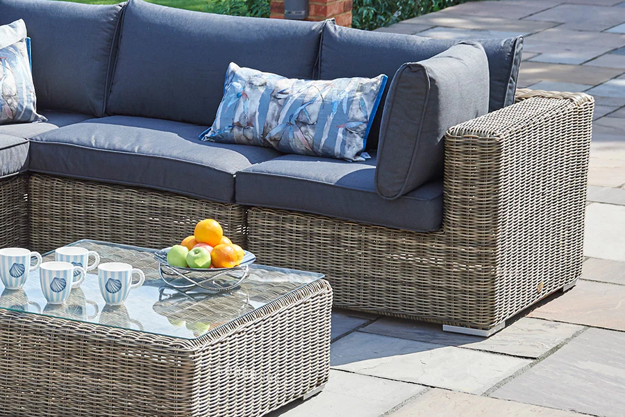 Offering brilliant value without compromising on design, the coffee table has been crafted using a mild Olive Brown synthetic rattan woven around an aluminium frame to guarantee over 2,000 hours of sun resistance. The tables safety glass top is easy to clean after any rainfall or spillages while metal feet provide a sturdy base to this gorgeous piece.