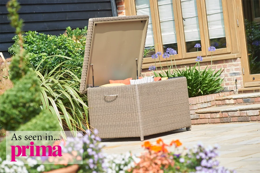 This rattan Cushion Storage Box looks fantastic alongside outdoor furniture from our Kensington Collection.