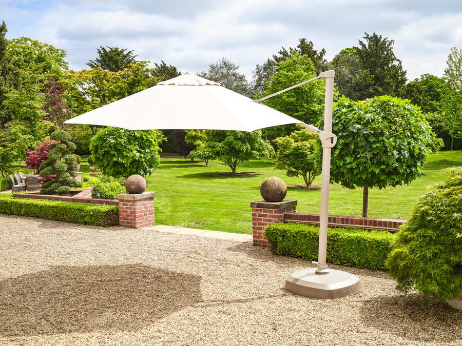Create a shaded retreat in your garden with this elegant Siesta Cantilever Almond Parasol and matching Base.
